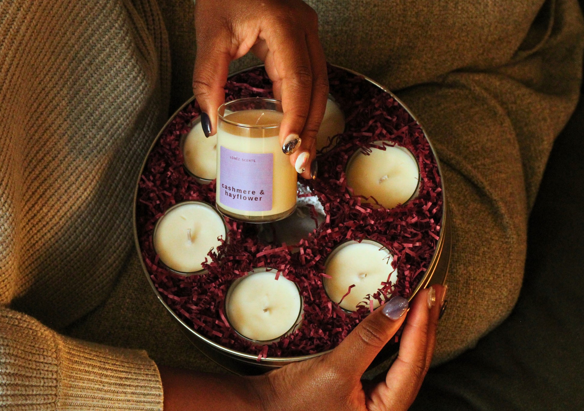 Seven 3 oz candles in a commemorative tin. The candles in the tin assortment of our Fall on the Horizon, seasonal candle release. The tin is wrapped with a beautiful, custom LS label - ready to be gifted and enjoyed.